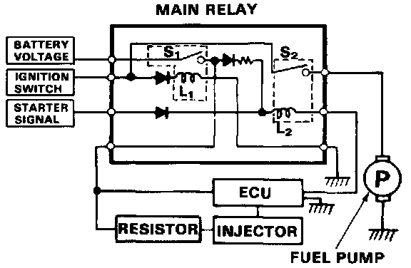 The main relay actually contains two individual relays. This relay is installed at the left side of the cowl. One relay is energized whenever the ignition is on which supplies the battery voltage to the ECU, power to the injectors, and power for the second relay.