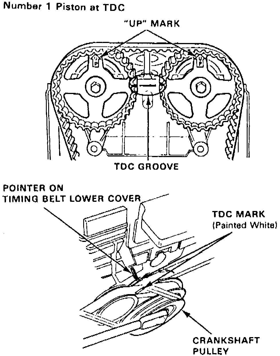1. Position cylinder No. 1 at TDC of compression stroke with UP marks on camshaft pulleys on top and TDC grooves on pulley aligning with cylinder head surface, Fig. 56. Distributor rotor should also be pointing toward No. 1 plug wire.