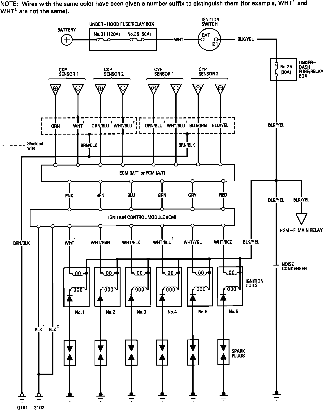 NOTE: Several different wires have the same color. They have been given a number suffix to distinguish them (for example WHT 1 and WHT 2 are not the same).