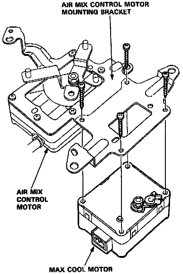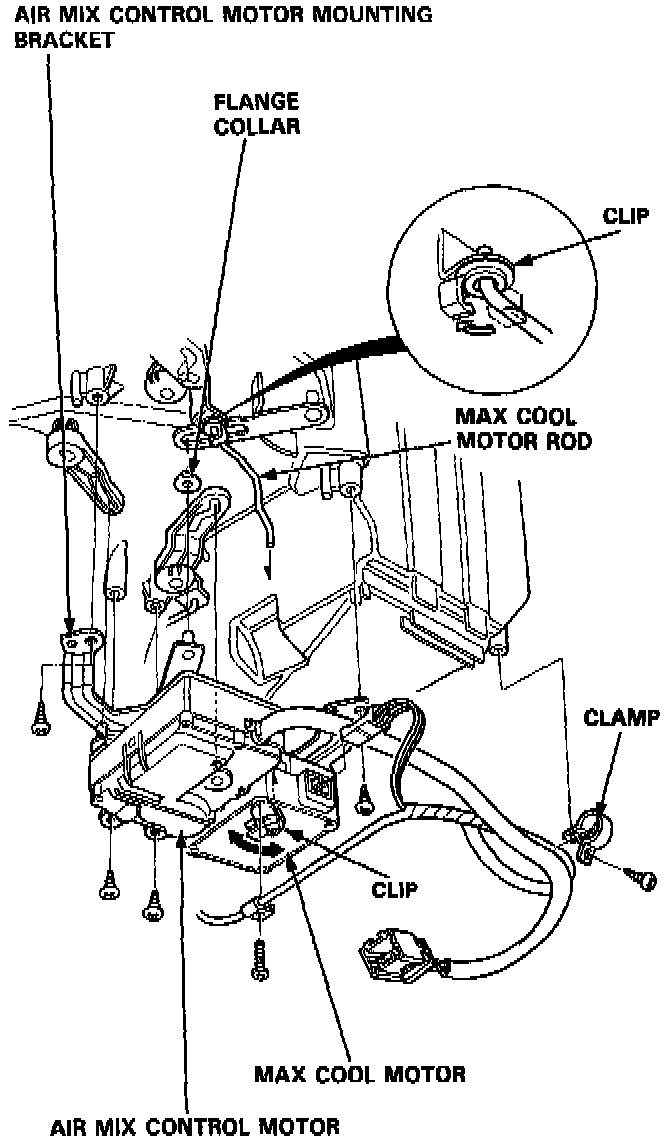 3. Unhook the clips from the max cool motor rod, then remove the mounting screws and air mix control motor mounting bracket.