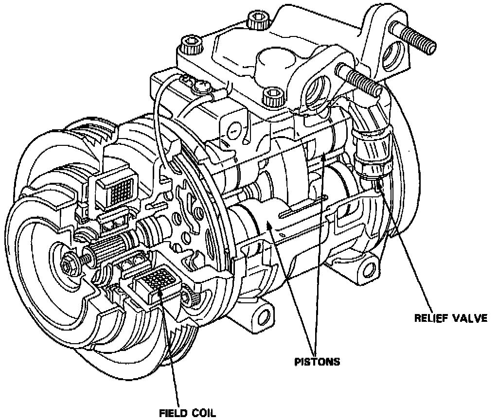 The compressor is a Nippondenso piston type for R-134a. A revolving inclined disc drives the surrounding 10 reciprocating pistons. As the inclined disc revolves, it pushes the pistons, protected by a ceramic shoe, thus compressing the refrigerant.