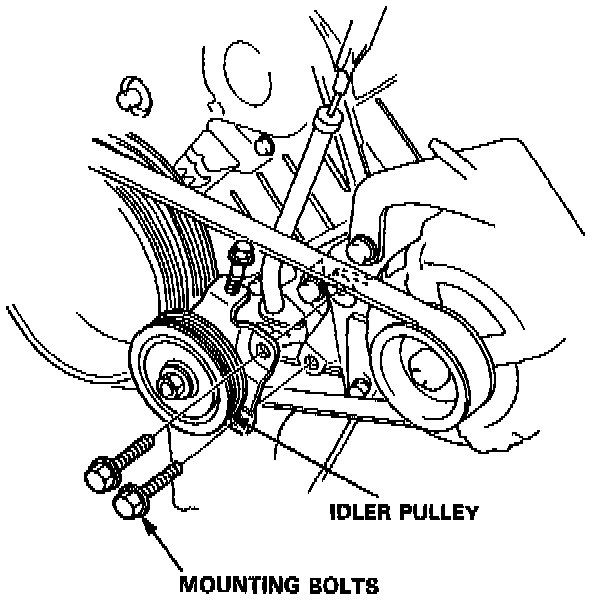 6. Loosen the idler pulley center nut and adjusting bolt, then remove the A/C compressor belt from the compressor.