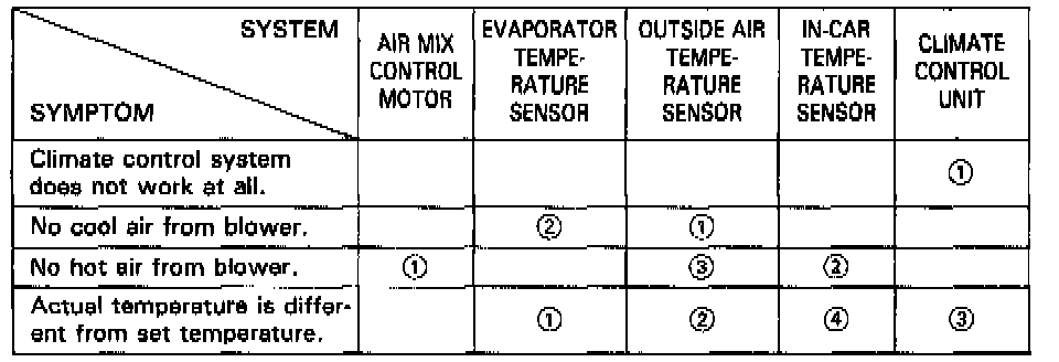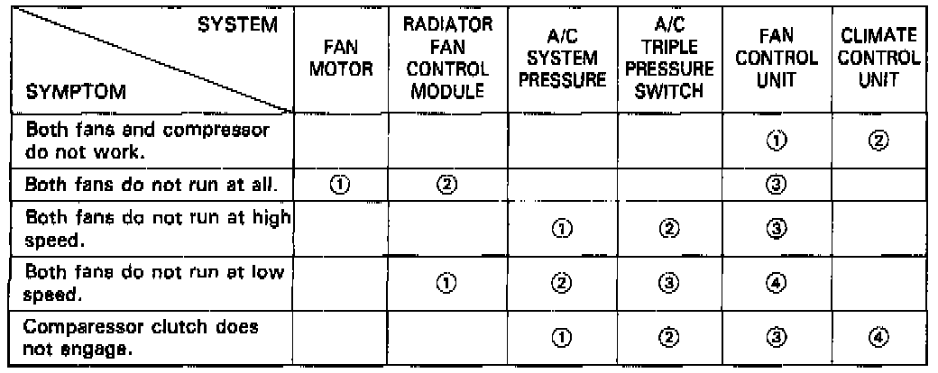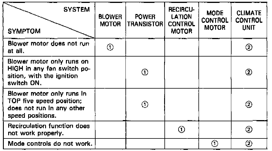 - Across each row in the chart, the potential sources of a symptom are ranked in the order they should be inspected, starting with [1]. Find the symptom in the left column, read across to the most likely source, then refer to the component listed at the top of that column. If inspection shows the component is OK, try component [2], etc.
