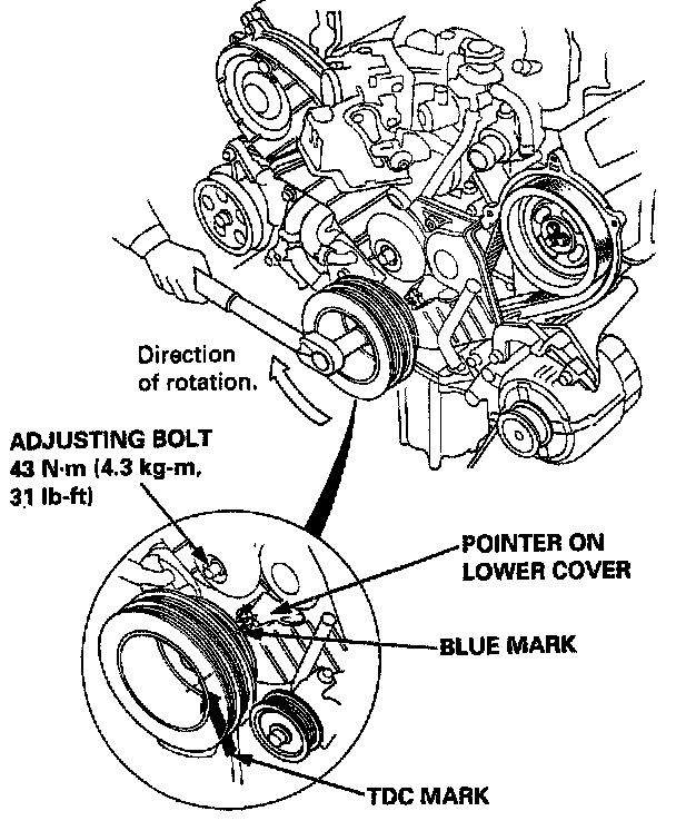 - Always rotate the crankshaft clockwise when viewed from the pulley side. Rotating it counterclockwise may result in improper adjustment of the belt tension.