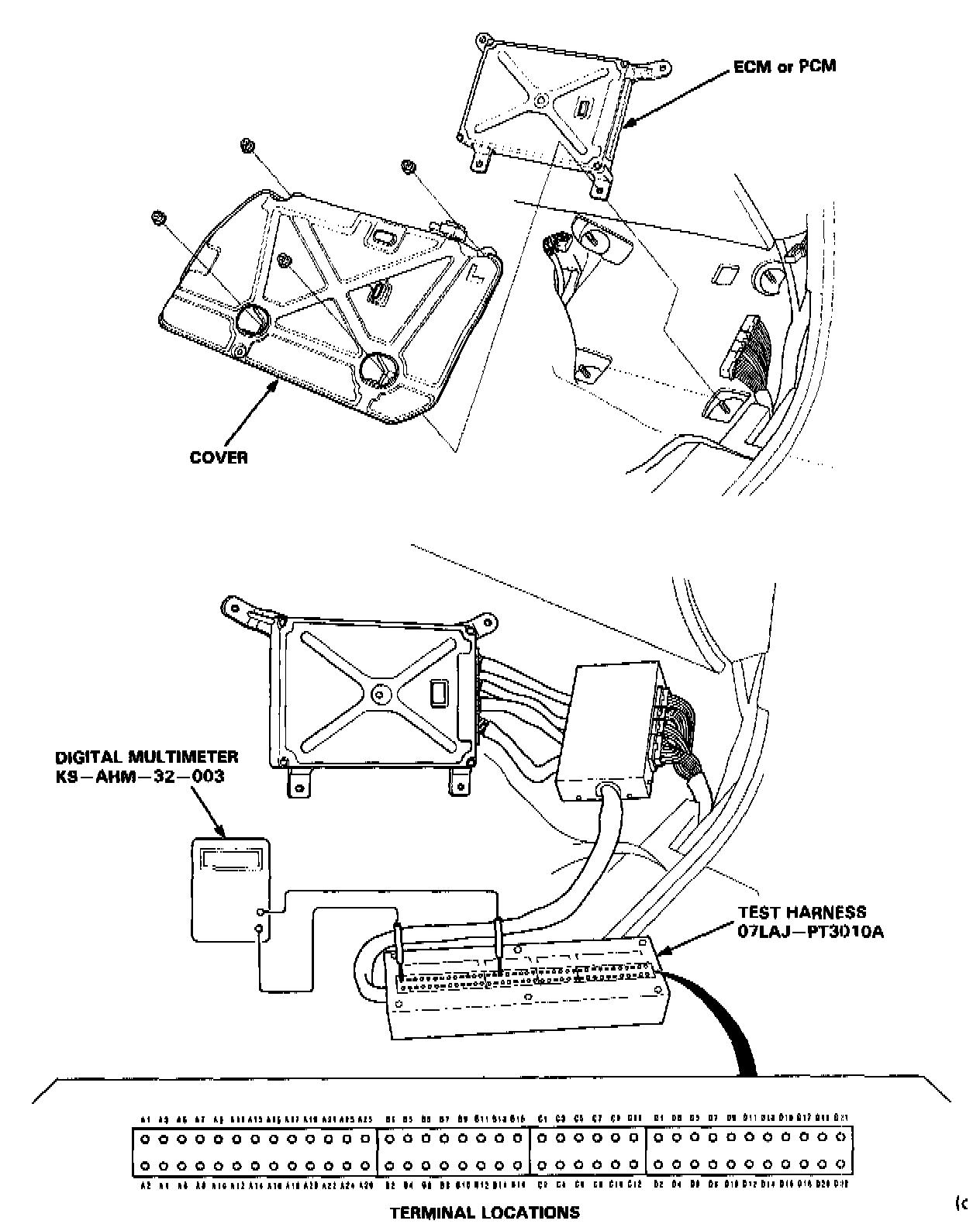 If the inspection for a particular code requires the test harness, remove the right door sill molding and the small cover on the right kick panel and pull the carpet back to expose the ECM or PCM. Unbolt the cover. Then disconnect the connector from the radiator fan control unit and connect the test harness.