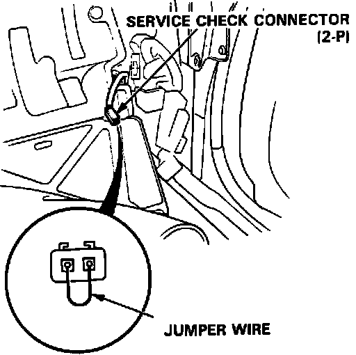 2. Pull out the SERVICE CHECK CONNECTOR located under the dash on the right side. Connect the WHT and BLK terminals with a jumper wire.