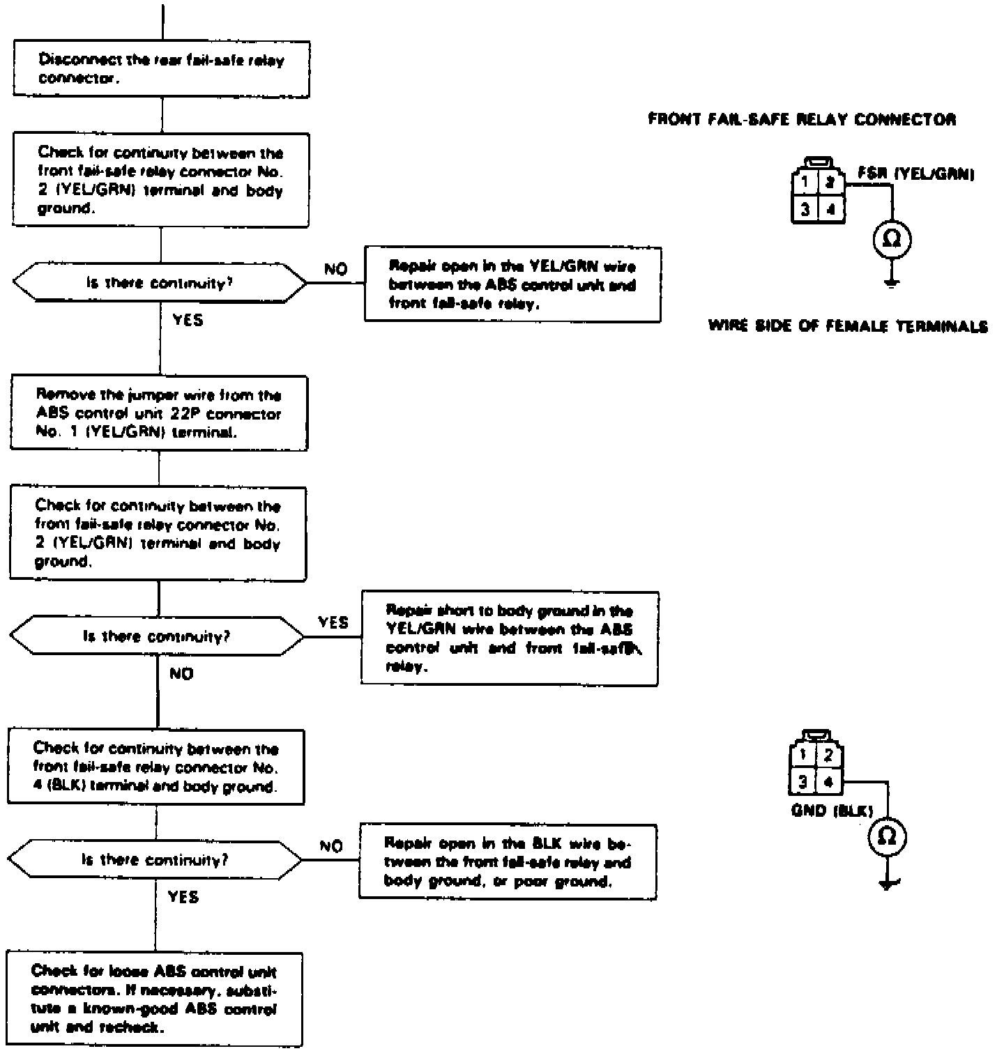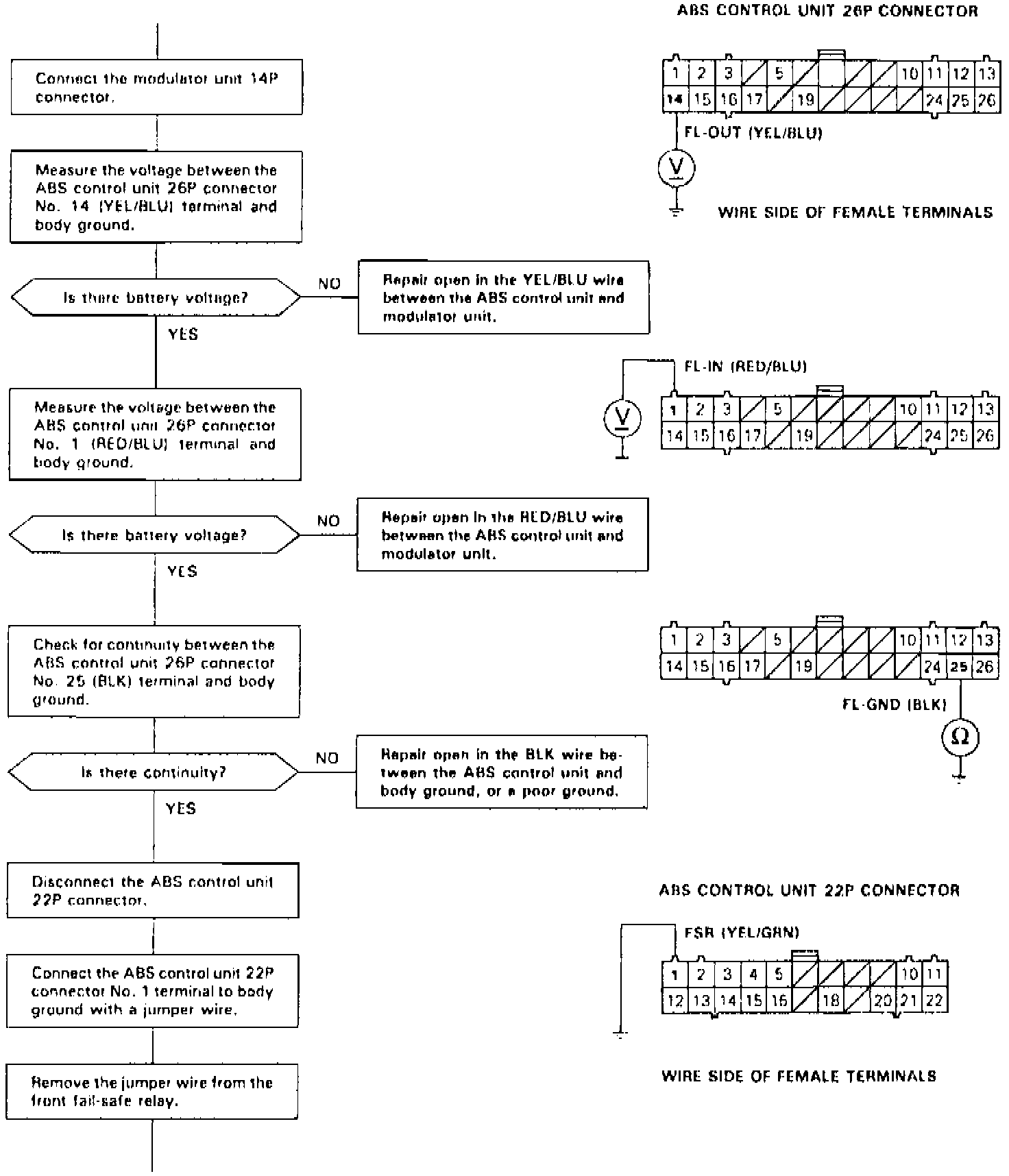 During the initial diagnosis, after the fail-safe relays are turned on, and during the regular diagnosis, the ABS control unit monitors the voltage from the battery for the six solenoids (when the ABS is not functioning).