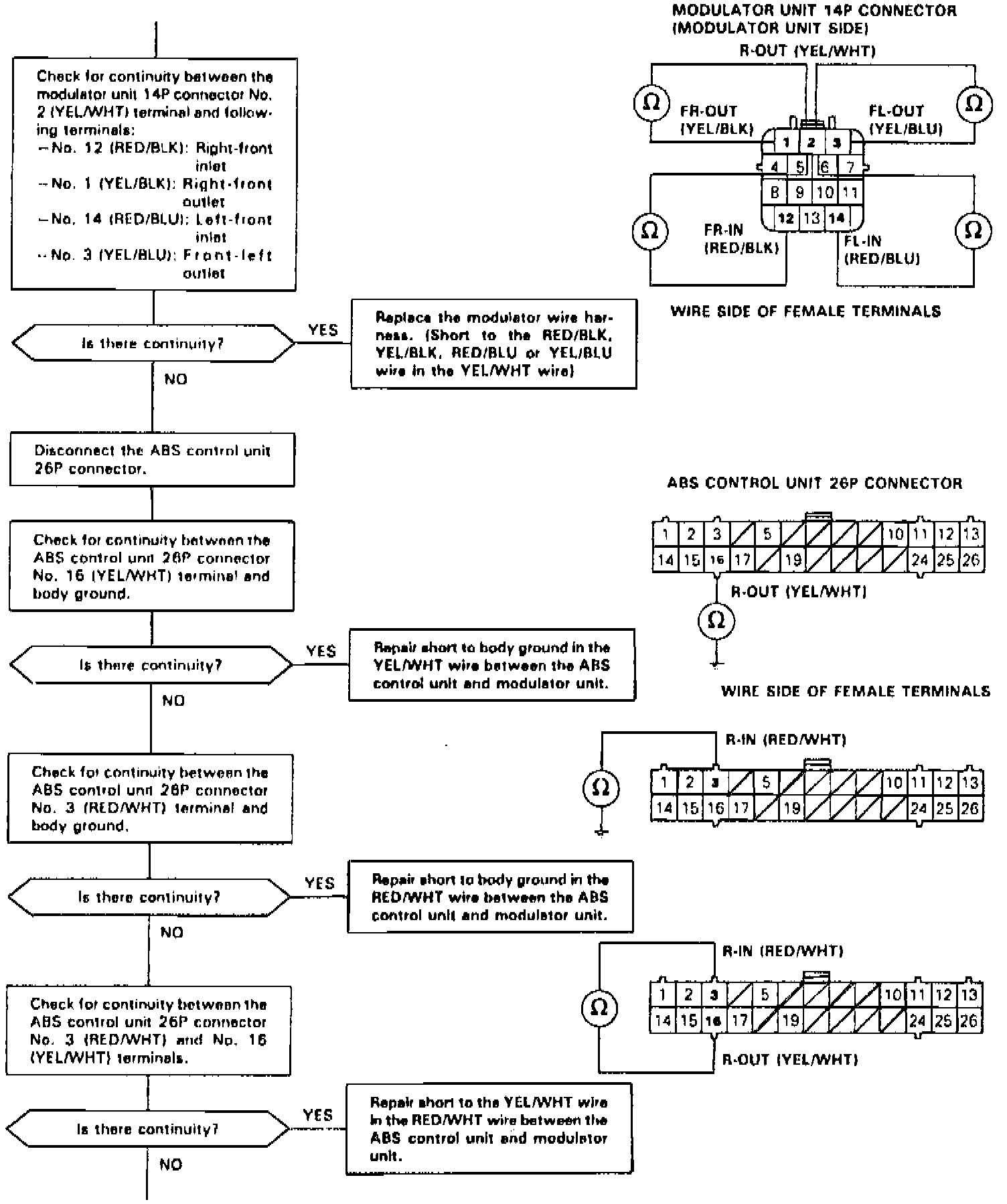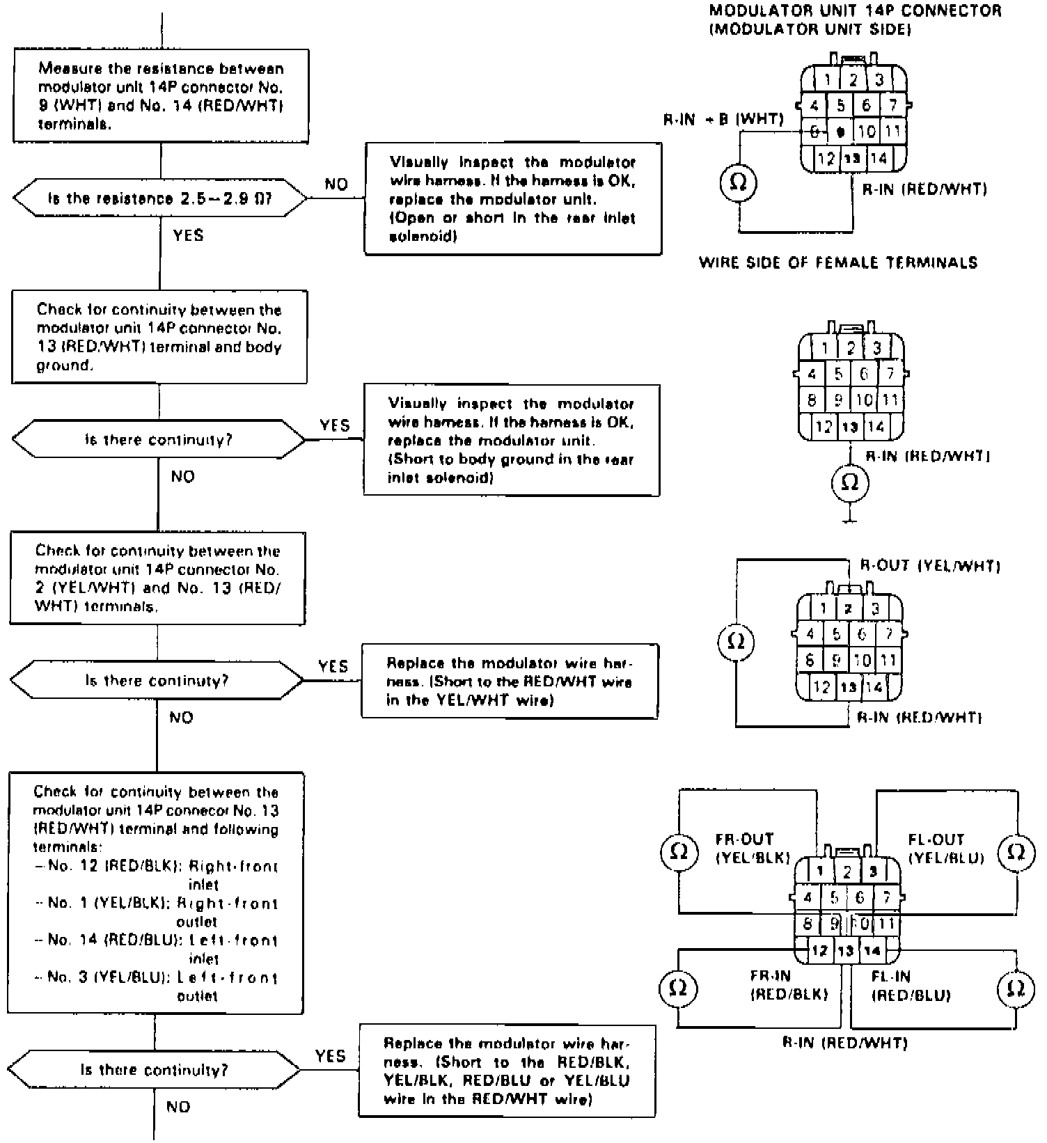 - Short circuit to the right-front or left-front solenoid inlet or outlet circuit in the rear solenoid inlet or outlet circuit between the solenoids and ABS control unit.