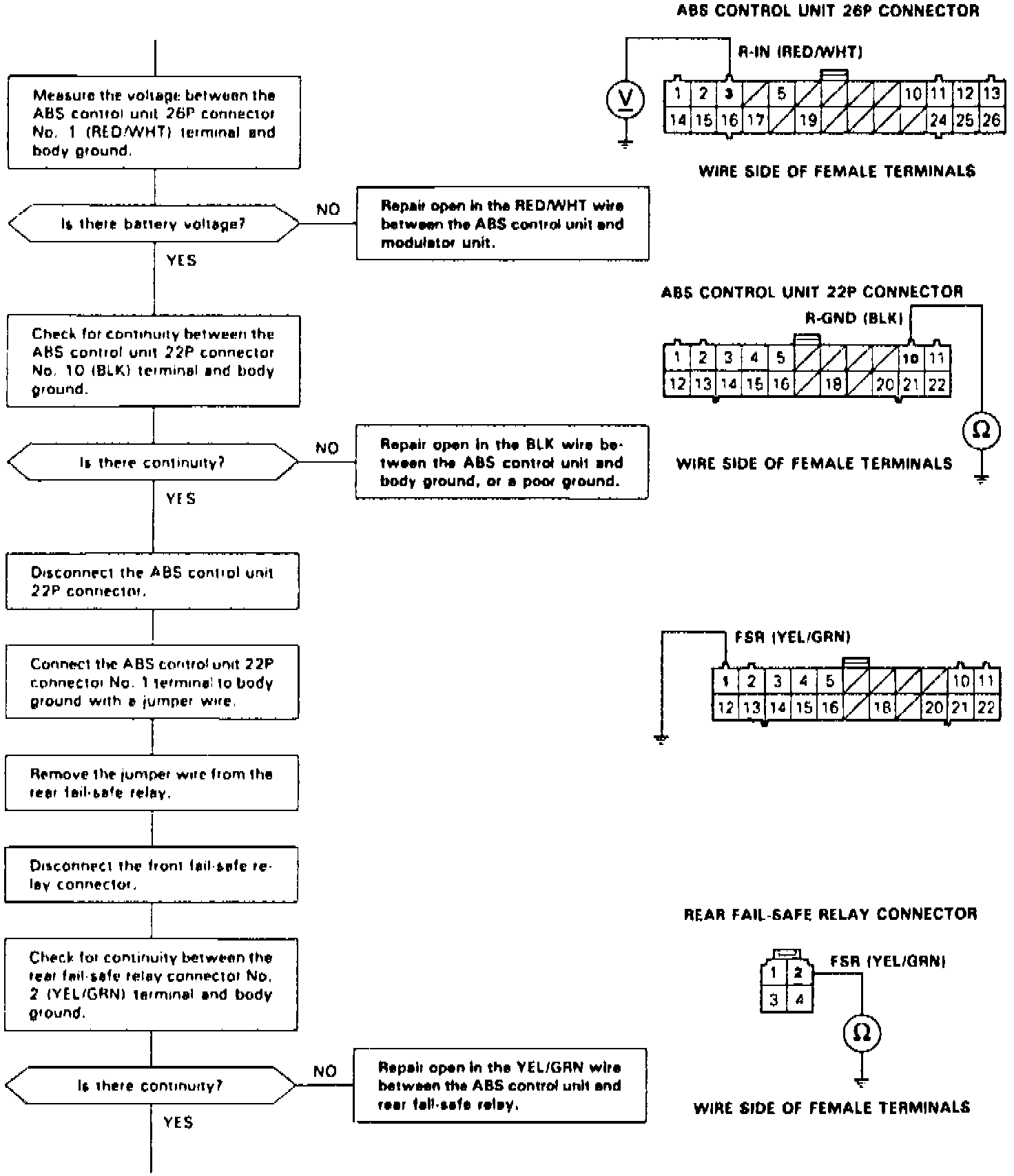 During the initial diagnosis, after the fail-safe relays are turned on, and during the regular diagnosis, the ABS control unit monitors the voltage from the battery for the six solenoids (when the ABS is not functioning).