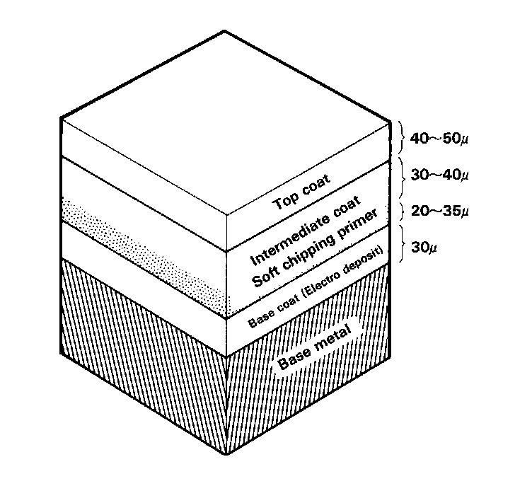 The soft chipping guard primer is applied over the E.D. (Electrostatically Deposited) primer. It is followed by guide coating and top coating.