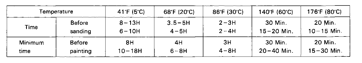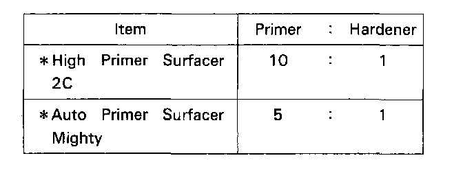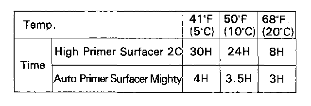 NOTE: The upper line of time shows specifications for High Primer Surfacer 2C, and the lower line Auto Primer Surfacer Mighty.