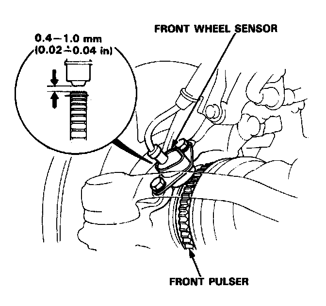 (A front wheel sensor and pulser are shown; the rear wheel sensors and pulsers are similar.)