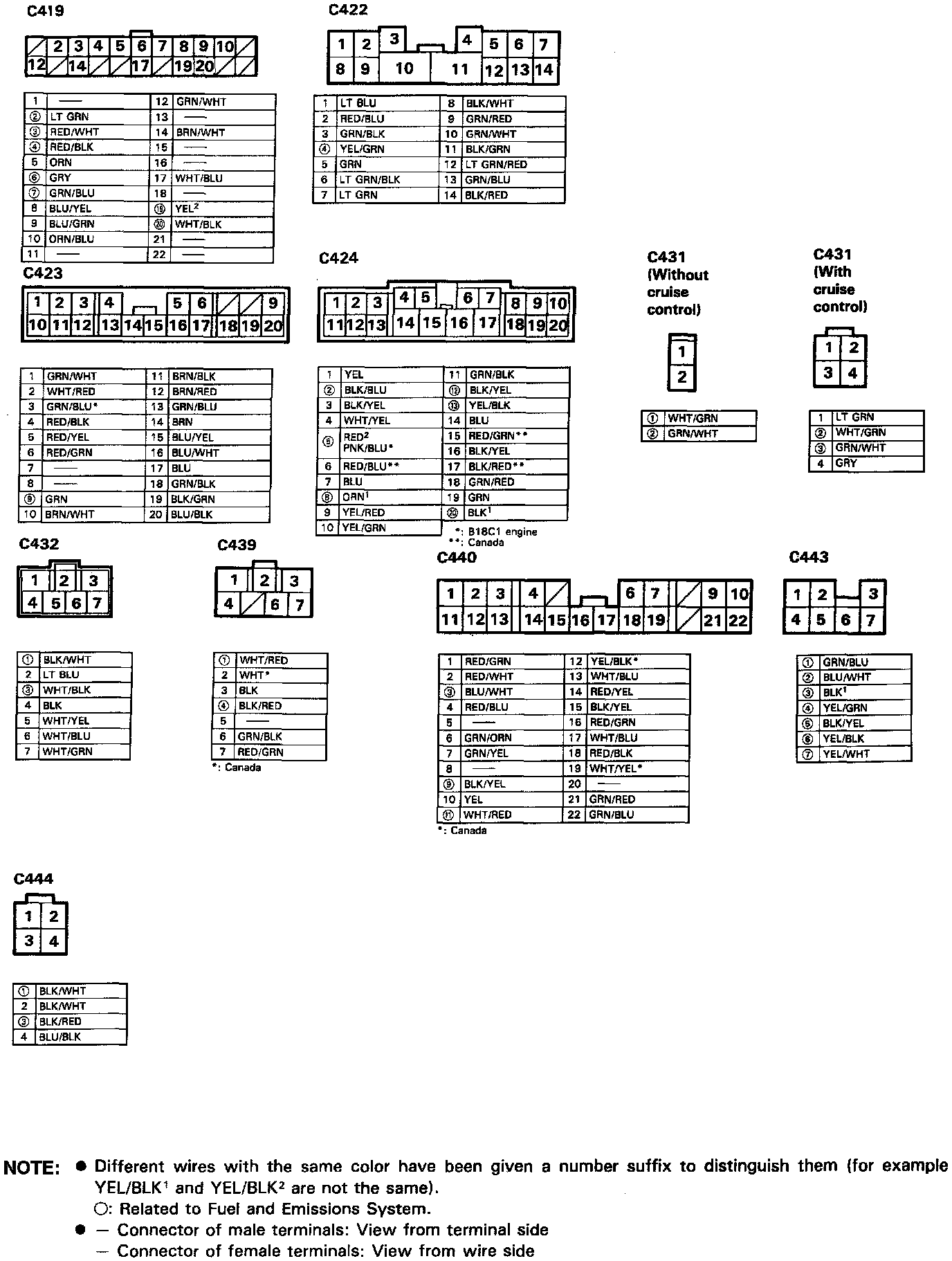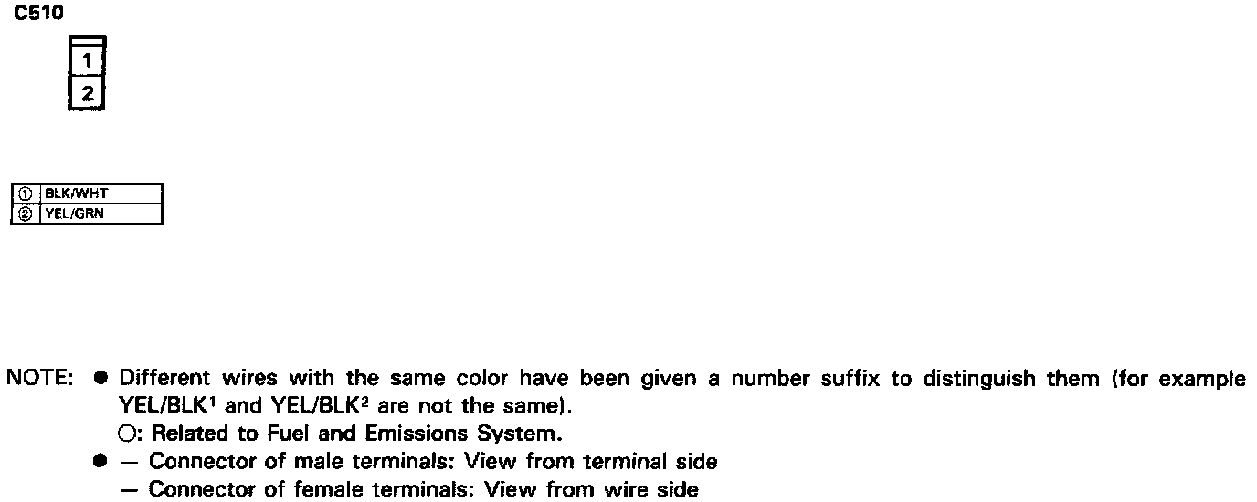- Different wires with the same color have been given a number suffix to distinguish them (for example, YEL/BLK1 and YEL/BLK2 are not the same).