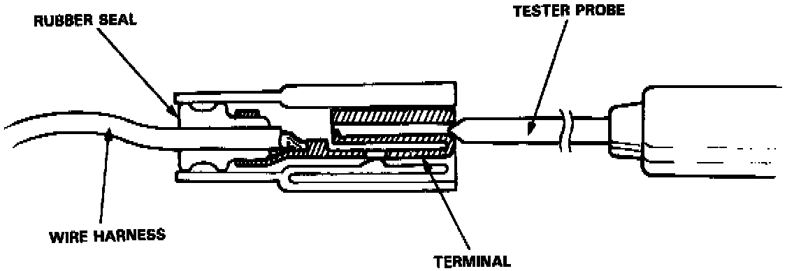 ^ For testing at connectors other than the test harness, bring the tester probe into contact with the terminal from the connector side of wire harness connectors in the engine compartment. For female connectors, just touch lightly with the tester probe and do not insert the probe.