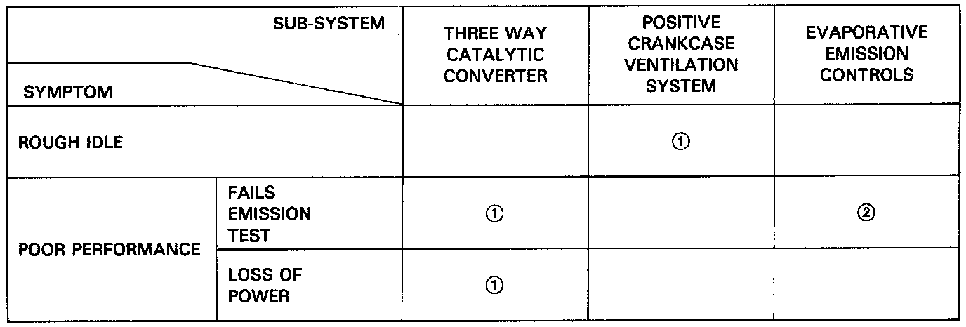 NOTE: Across each row in the chart, the sub-systems that could be sources of a symptom are ranked in the order they should be inspected starting with 1. Find the symptom in the left column, read across to the most likely source, then refer to the page listed at the top of that column. If inspection shows the system is OK, try the next system 2, etc.