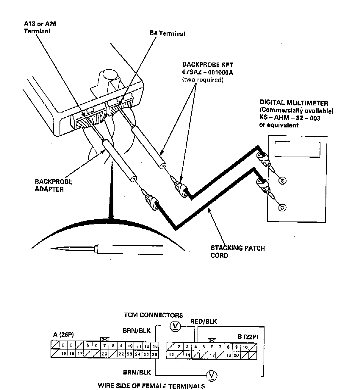 b. Set the digital multimeter to check voltage between B4 (+) terminal and A13 or A26 (-) terminal for the throttle position sensor.