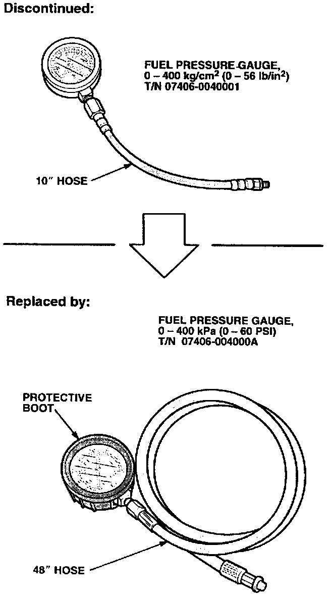 The fuel pressure gauge with 10" hose (T/N 07406-0040001) has been discontinued. The gauge that replaces it (T/N 07406-004000A) has an easier-to-read face, a protective boot around the gauge housing, and a 48" hose.