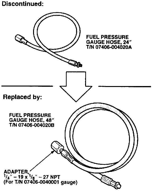 The replacement hose for the old gauge (24", T/N 07406-004020A) has also been discontinued. If you need a replacement hose, order the new 48" hose (T/N 07406-004020B). The new hose comes with an adapter so you can use it with the old fuel pressure gauge (T/N 07406-0040001).