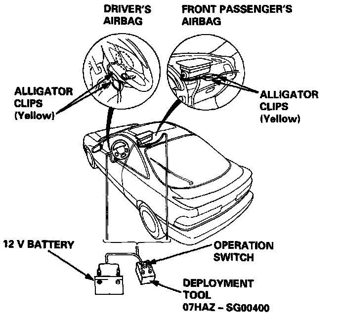 NOTE: If an SRS car is to be entirely scrapped, its airbag(s) should be deployed while still in the car. The airbag(s) should not be considered as salvageable pant(s) and should never be installed in another car.