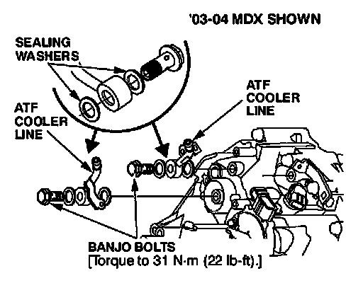 Got ATF leaking from any of the A/T banjo bolts? The first thing you need to do is replace the sealing washers. Next, start threading the banjo and line bracket bolts in their holes. Finally, torque the banjo bolt to 31 Nm (22 lb-ft) and the line bracket bolt to 9.8 Nm (7.2 lb-ft.).