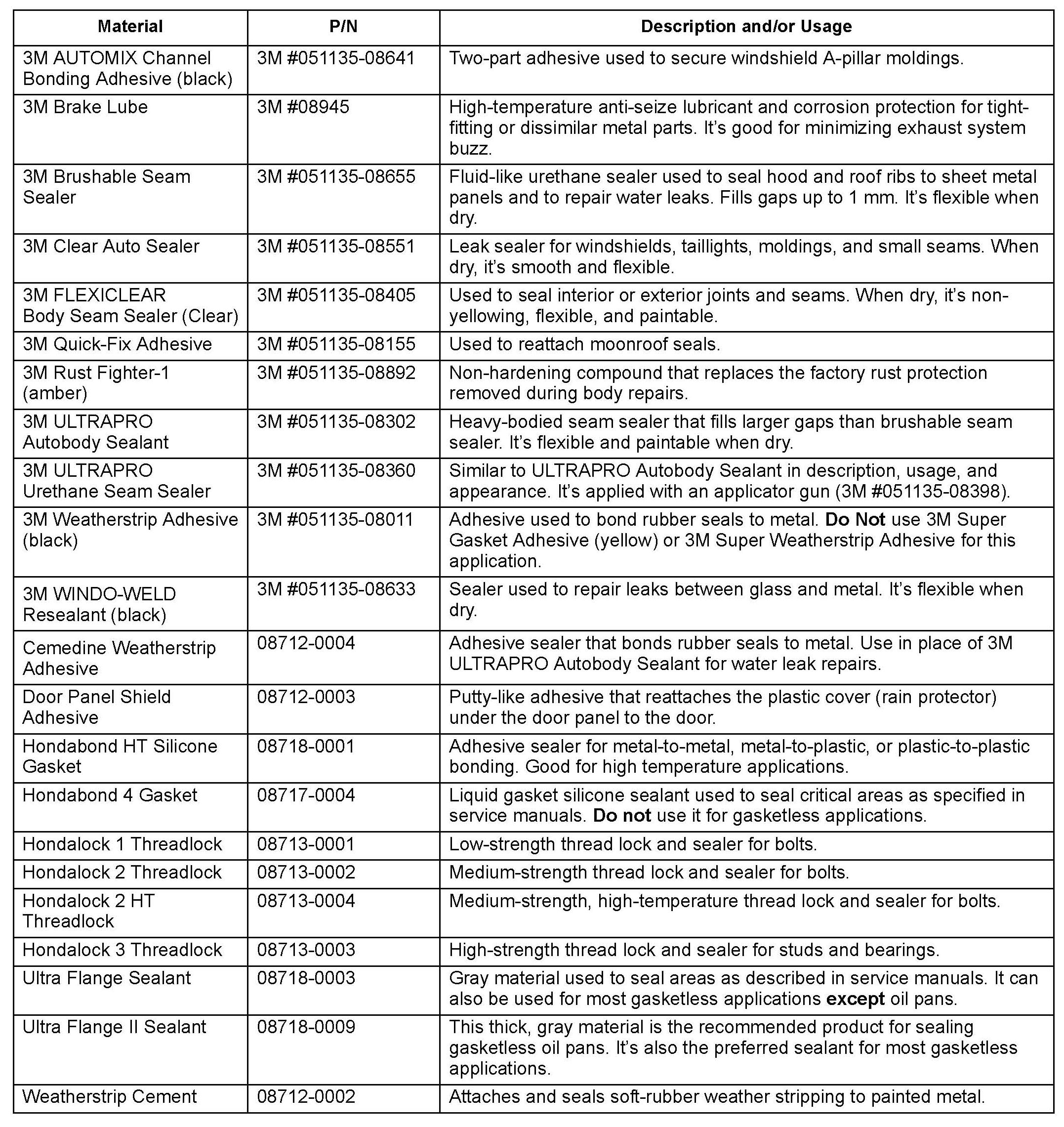 Many procedures in service bulletins and other service publications require you to use adhesives, sealants, lubricants, solvents, wool felt, EPT sealer, etc. While some of these materials look and feel similar to each other or to non-approved materials, always use the recommended material to save yourself a costly comeback and a dissatisfied client. Remember, a material that's "almost the same" probably wont do the job.