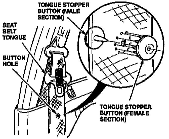 1. Slide the seat belt tongue up the seat belt past the tongue stopper button hole. Temporarily secure the seat belt tongue to the belt fabric with masking tape.