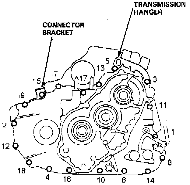 26. Install the transmission housing mounting bolts along with the transmission hanger and the connector bracket, then torque the bolts in two or more steps in the sequence shown.