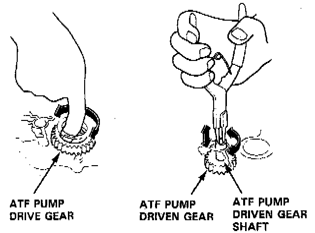 11. If the ATF pump drive gear and ATF pump driven gear shaft do not move freely, loosen the four bolts on the main valve body and disassemble the valve bodies. Realign the ATF pump driven gear shaft and reassemble the valve bodies, then retighten the bolts to the specified torque.