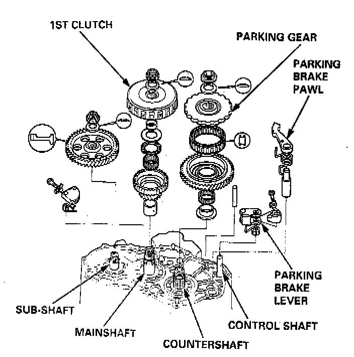 29. Assemble the one-way clutch and the parking gear with the countershaft 1st gear.