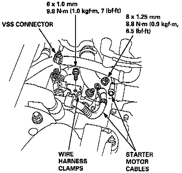 19. Connect the vehicle speed sensor (VSS) connector and the starter motor cables.