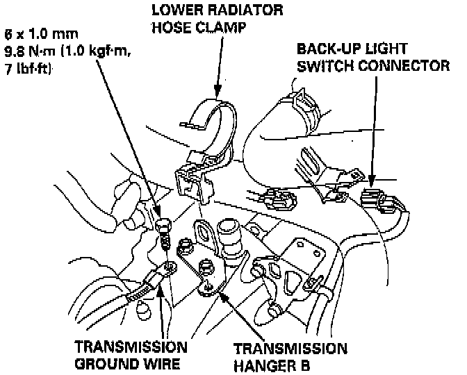 21. Install the lower radiator hose clamp on the transmission hanger B.