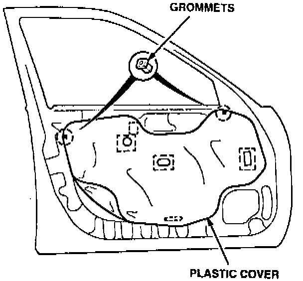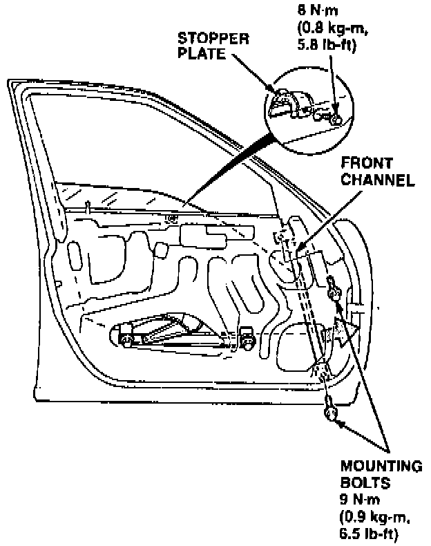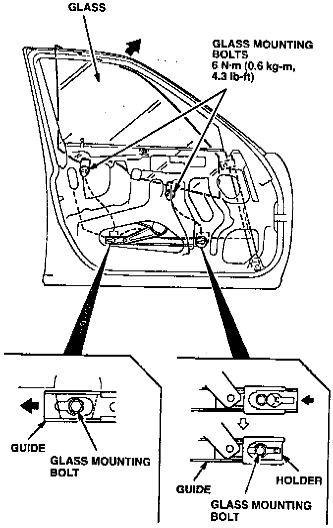 6. Lower the window until you can see the glass mounting bolts. Loosen the bolts, slide the guide to the rear, and pull the glass out through the opening.
