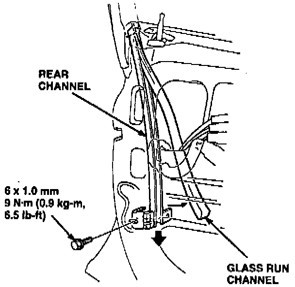 7. Remove the glass run channel from the rear channel. Remove the mounting bolt, then remove the rear channel.