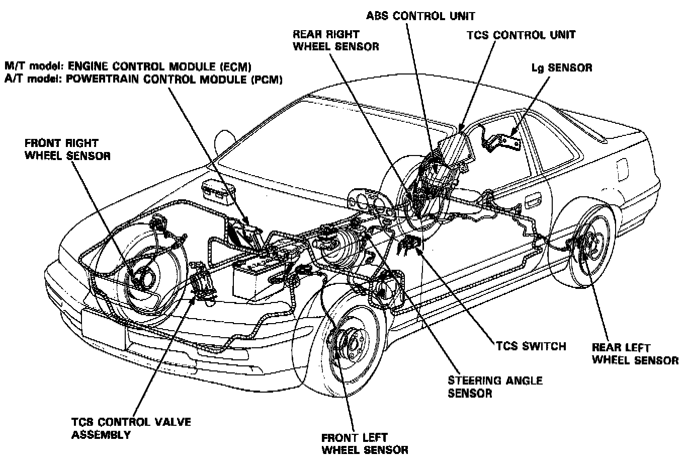The TCS control unit gets signals about the vehicle's speed, direction and road conditions from the wheel sensors, steering angle sensor and lateral acceleration (Lg) sensor. Based on these signals, the control unit will determine the optimum amount of wheel spin. Because the system is variable, the control unit may determine, depending on the driving conditions, that some wheel spin is beneficial (thus enhancing straight-line acceleration), or that no wheel spin is beneficial (thus enhancing cornering). For any given driving situation, the control unit will determine the amount of wheel spin best suited to the driver's needs and, if necessary, will then signal the TCS control valve actuator, and Engine Control Module (ECM) for M/T or Powertrain Control Module (PCM) for A/T to reduce engine power.