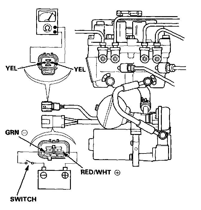 2. Attach the positive (+) lead of a fully charged 12 V battery to the RED/WHT terminal of the pump motor connector and negative (-) lead to the GRN terminal, and install a switch between as shown.
