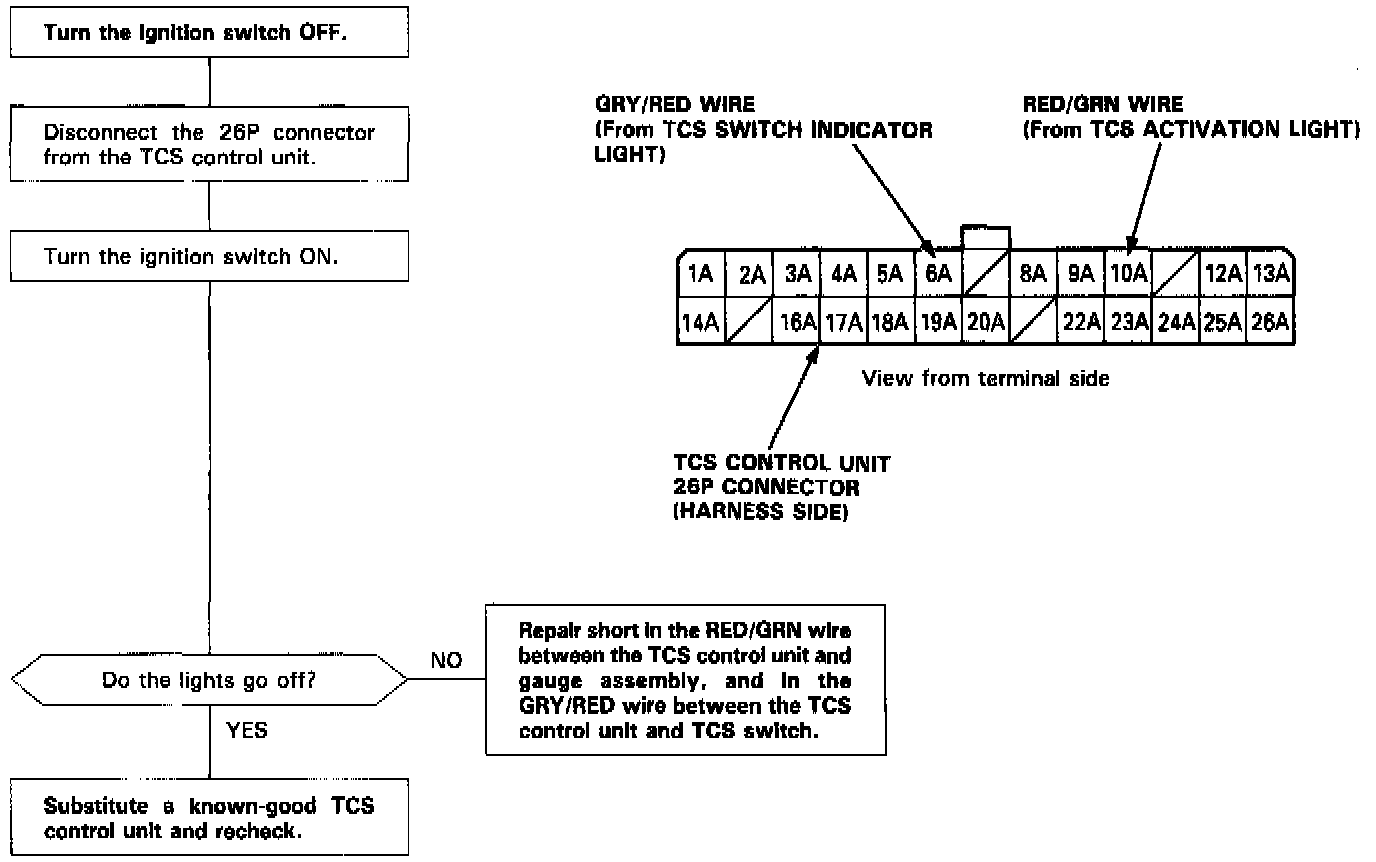 The TCS switch indicator light and the TCS activation light do not go off two seconds after the ignition switch is turned on.