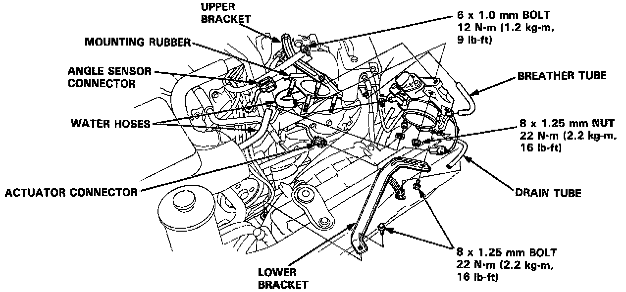 Disconnect the TCS control valve angle sensor connector and actuator connector. Remove the drain tube from the clamp on the TCS control valve lower bracket. Disconnect the water hoses and breather tube from the TCS control valve body. Remove the TCS control valve brackets. Remove the four nuts and the TCS control valve assembly from the mounting rubber.