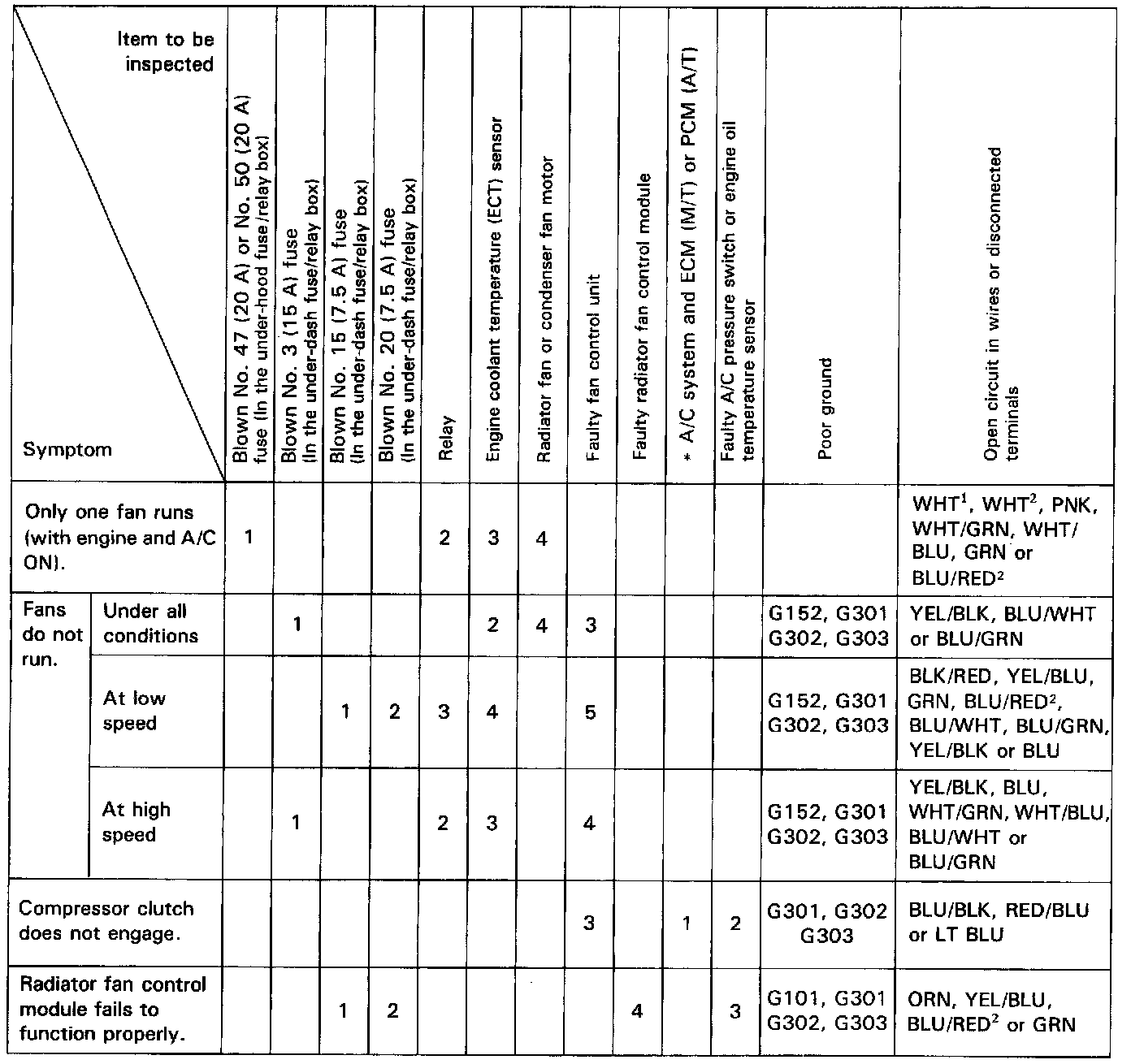 The numbers in the table show the troubleshooting sequence.