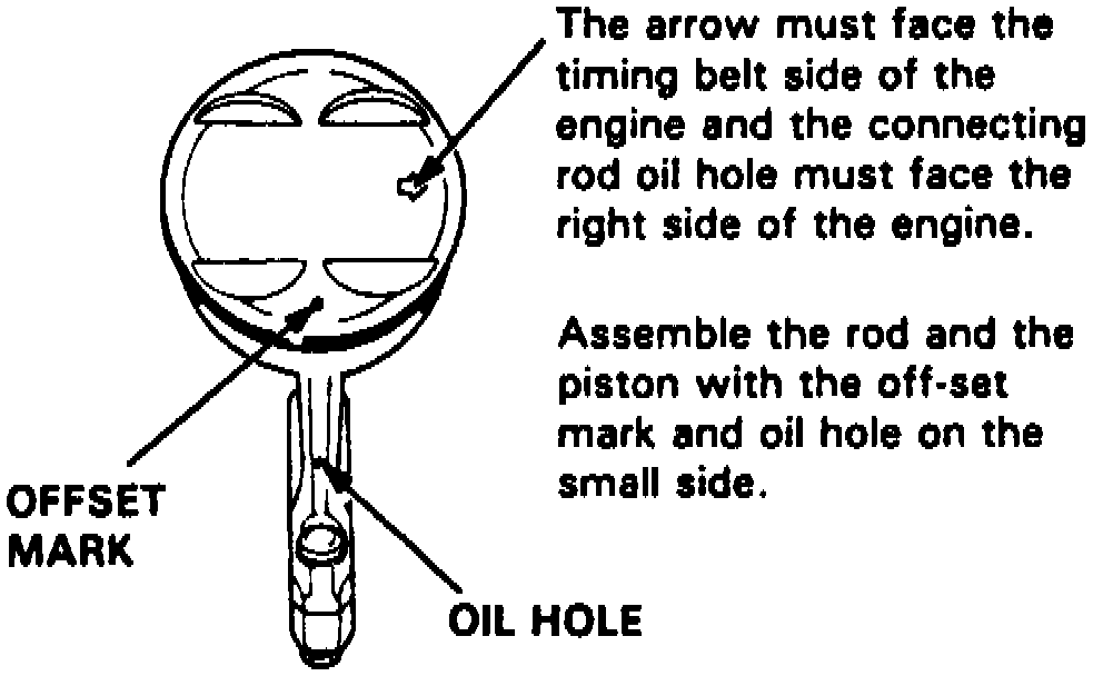 When installing connecting rod and piston assemblies into engine, arrow on piston head must face timing belt side of the engine and the connecting rod oil hole must face right side of the engine, Fig. 78.