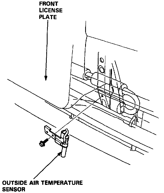 Remove the screw, disconnect the connector, then remove the outside air temperature sensor. Be careful not to damage the front grille and front bumper.