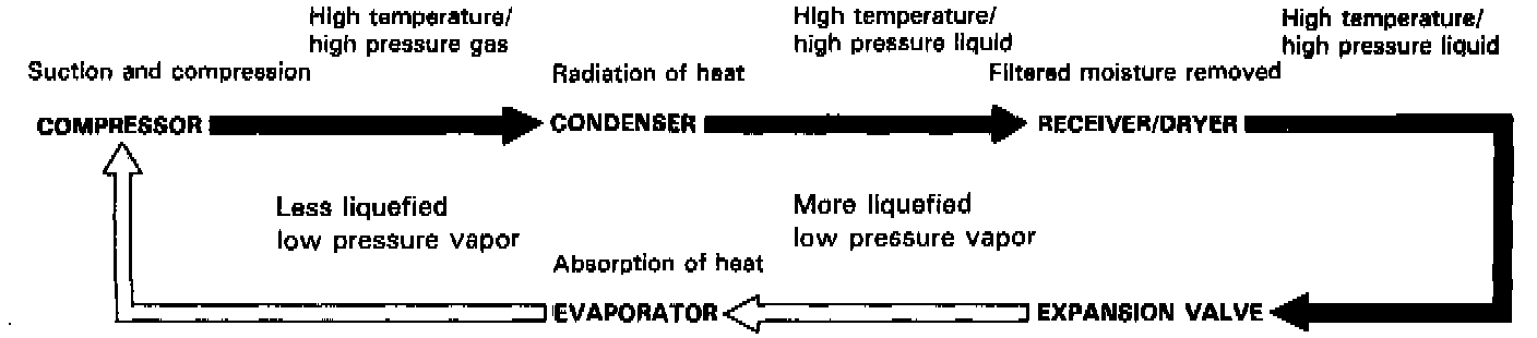 The air conditioner removes heat from the passenger compartment by circulating refrigerant through the system as shown. The air conditioning system is controlled by one of two electronic climate control systems: Manual Heating and Air Conditioning; or Automatic Climate Control.