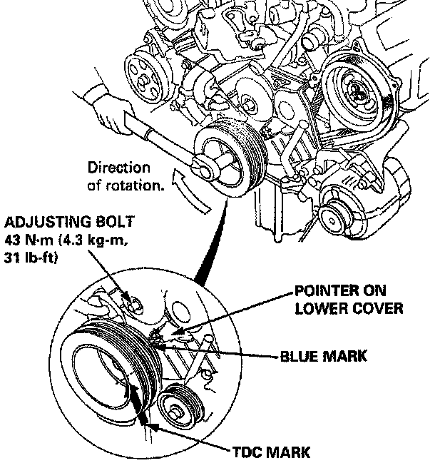 - Always rotate the crankshaft clockwise when viewed from the pulley side. Rotating it counterclockwise may result in improper adjustment of the belt tension.