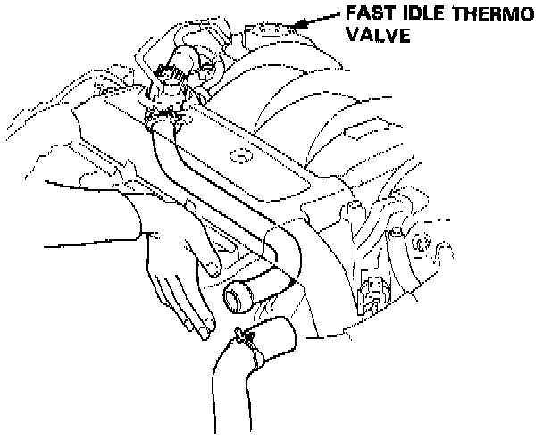 ^ If any suction is felt, the valve is leaking. Check engine coolant level and for air in the engine coolant system. If OK, replace the fast idle thermo valve and recheck.