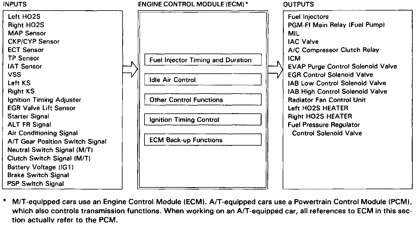 This vehicle is equipped with a Programmed Fuel Injection (PGM-FI) sequential multiport fuel injection system. This system uses sensor inputs to the Engine Control Module (ECM) to control engine fuel injector timing and duration, fuel pumping, idle speed, and spark timing. In addition, on automatic transmission equipped vehicles, the engine and transmission control functions are combined into a Powertrain Control Module (PCM) which uses the engine control information to determine shift timing and torque converter clutch lock-up.
