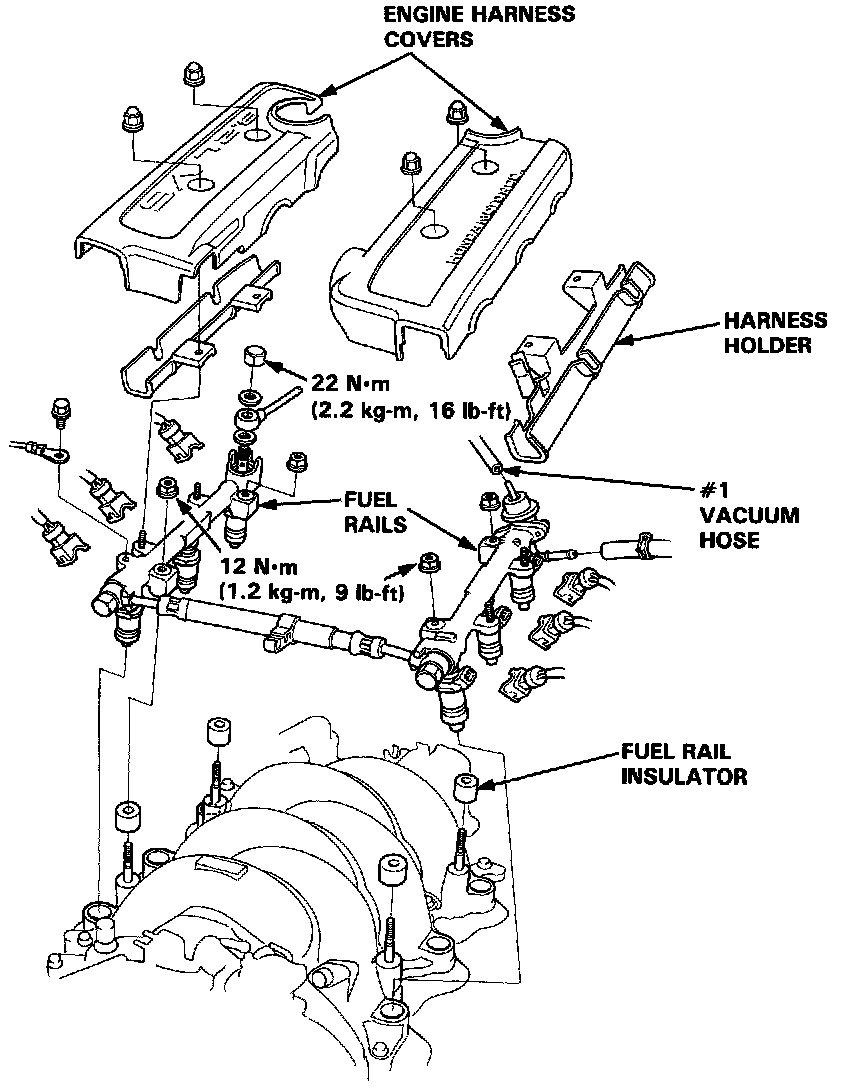 The fuel injectors are located in the intake manifold, below the engine harness covers.
