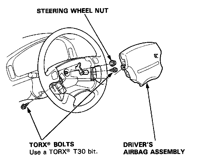 5. Remove the driver's airbag assembly from the steering wheel (two T30 TORX� bolts), then remove the steering wheel nut.