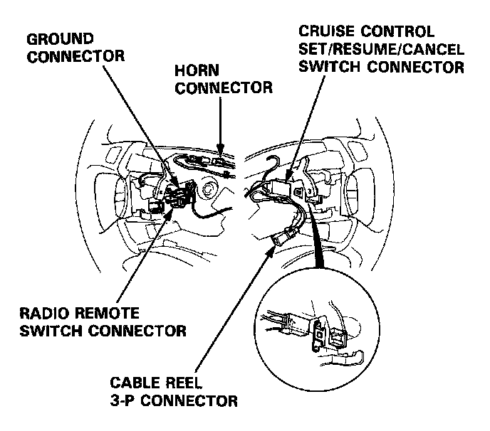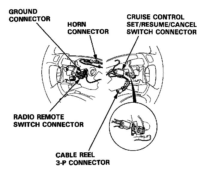 6. Disconnect the connectors from the horn and cruise control set/resume switches, then remove the cable reel 3-P connector from its clips.