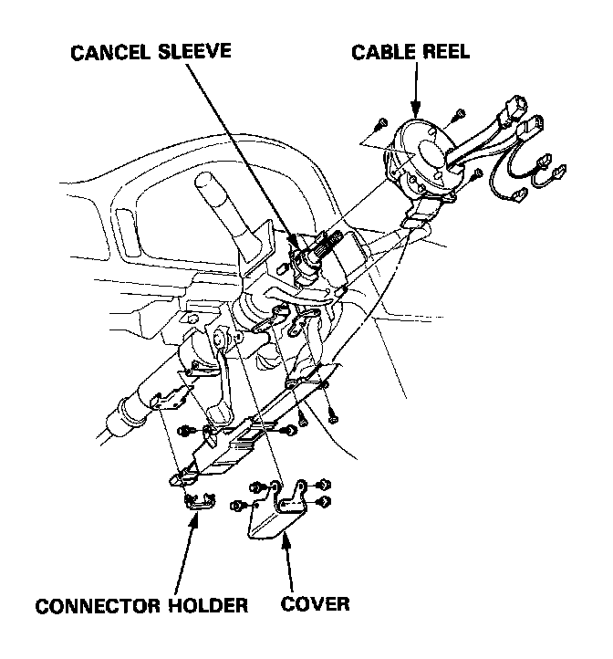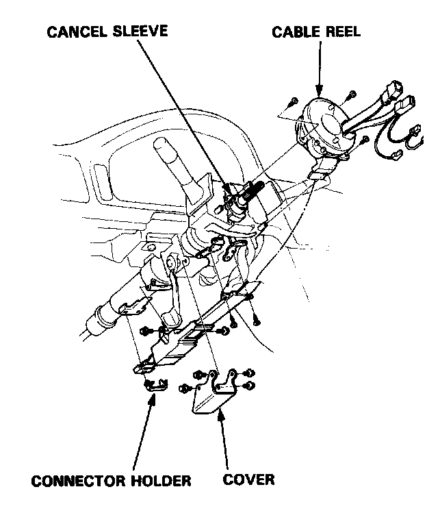 13. Carefully install the cable reel on the steering column shaft. Then attach the connector holder to the steering column. Reinstall the cover.