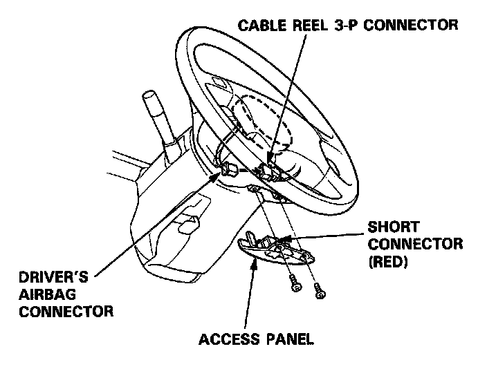 25. Reconnect the driver's airbag 3-P connector to the cable reel 3-P connector. Attach the short connector (RED) to the access panel, then reinstall the panel on the steering wheel.