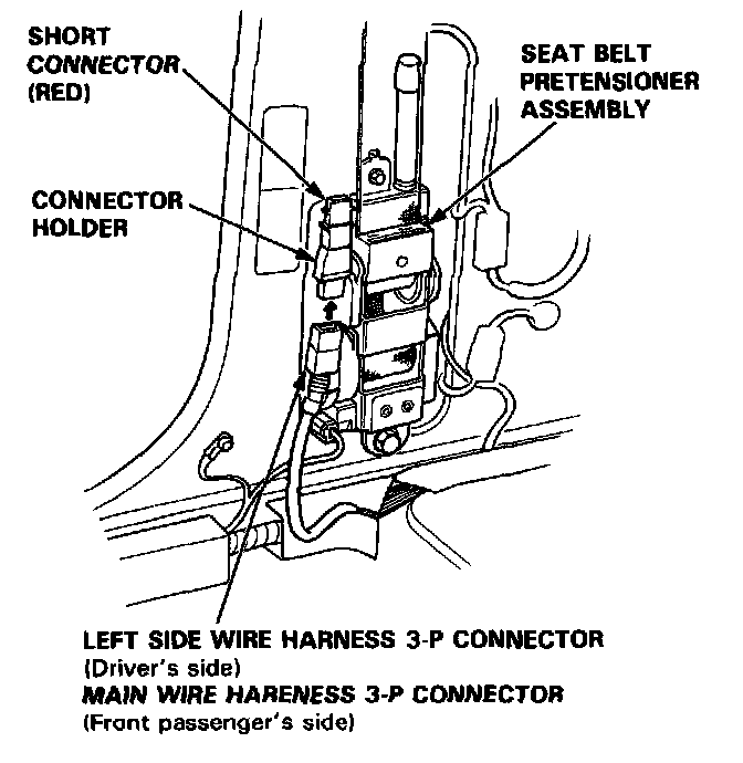 27. Reconnect the left side wire harness 3-P connector to the driver's seat belt pretensioner and the main wire harness 3-P connector to the front passenger's seat belt pretensioner.